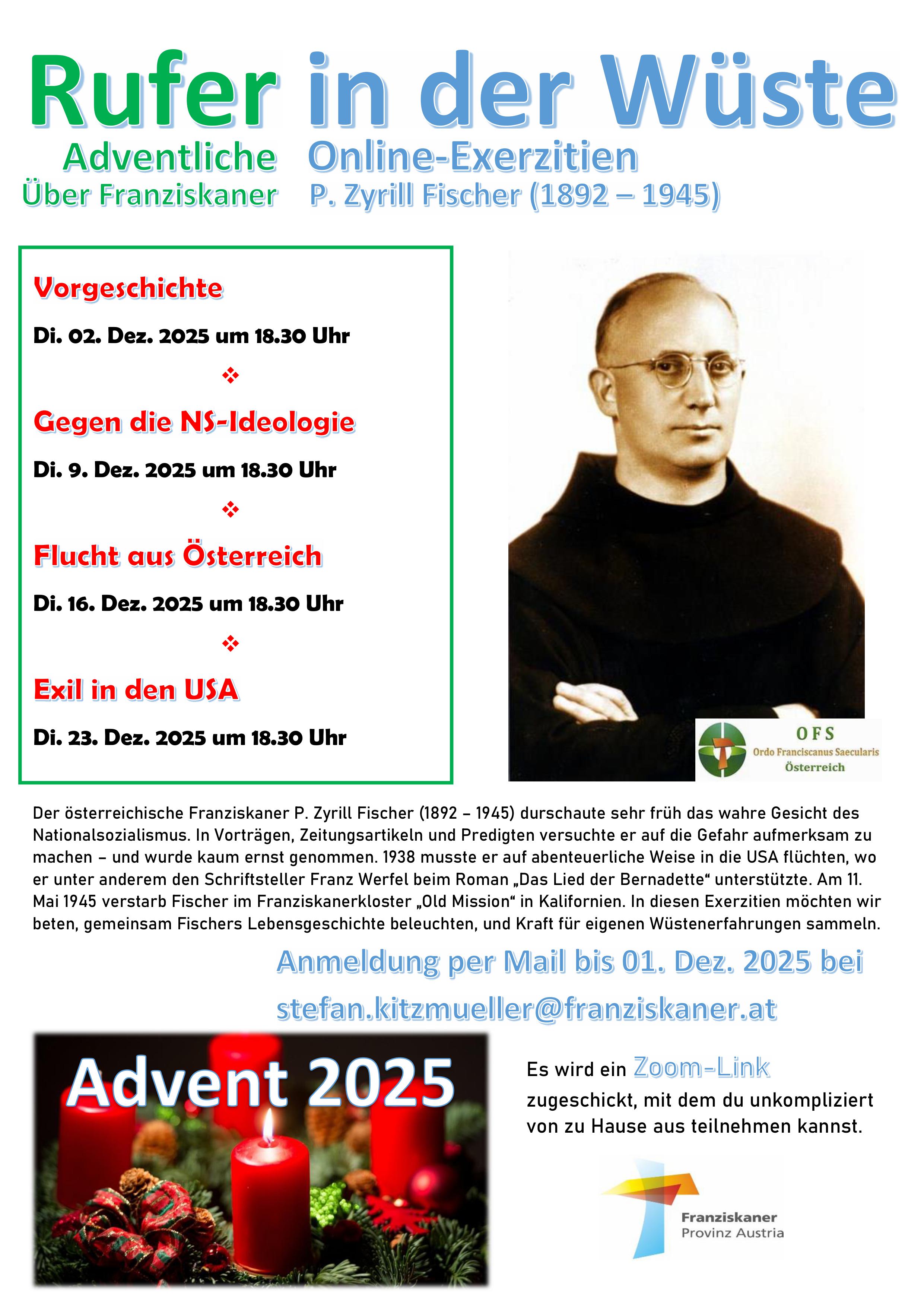 Der österreichische Franziskaner P. Zyrill Fischer (1892 – 1945) durschaute sehr früh das wahre Gesicht des Nationalsozialismus.In Vorträgen, Zeitungsartikeln und Predigten versuchte er auf die Gefahr aufmerksam zu machen – und wurde kaum ernst genommen. 1938 musste er auf abenteuerliche Weise in die USA flüchten, wo er unter anderem den Schriftsteller Franz Werfel beim Roman „Das Lied der Bernadette“ unterstützte. Am 11. Mai 1945 verstarb Fischer im Franziskanerkloster „Old Mission“ in Kalifornien. In diesen Exerzitien möchten wir beten, gemeinsam Fischers Lebensgeschichte beleuchten, und Kraft für eigenen Wüstenerfahrungen sammeln.